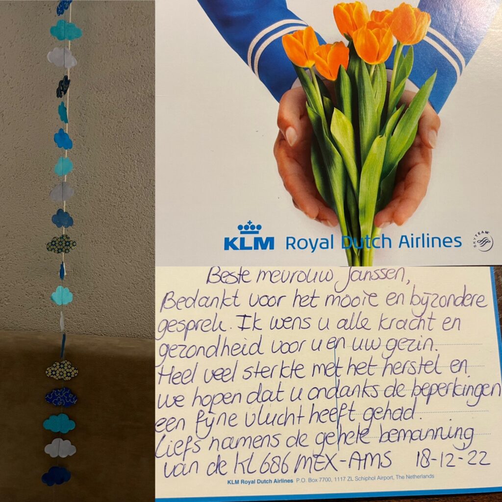 Wij waren met 5 “patiënten” vanuit Mexico op deze vlucht naar Schiphol/Amsterdam en wij konden in het kader van het Neutropene* eten, waar we ons voorlopig nog aan moeten houden, niet meedoen aan het eten welke door KLM werd opgediend. De stewardess had een luisterend oor en was zeer empatisch, ze deed enorm haar best om er nog iets van te kunnen maken voor ons. Ik kreeg een lief geschenkje met een handgeschreven kaart van haar. Uiteraard weet ik haar naam niet maar zo’n stewardess verdiend alle lof en KLM mag trots op haar zijn.